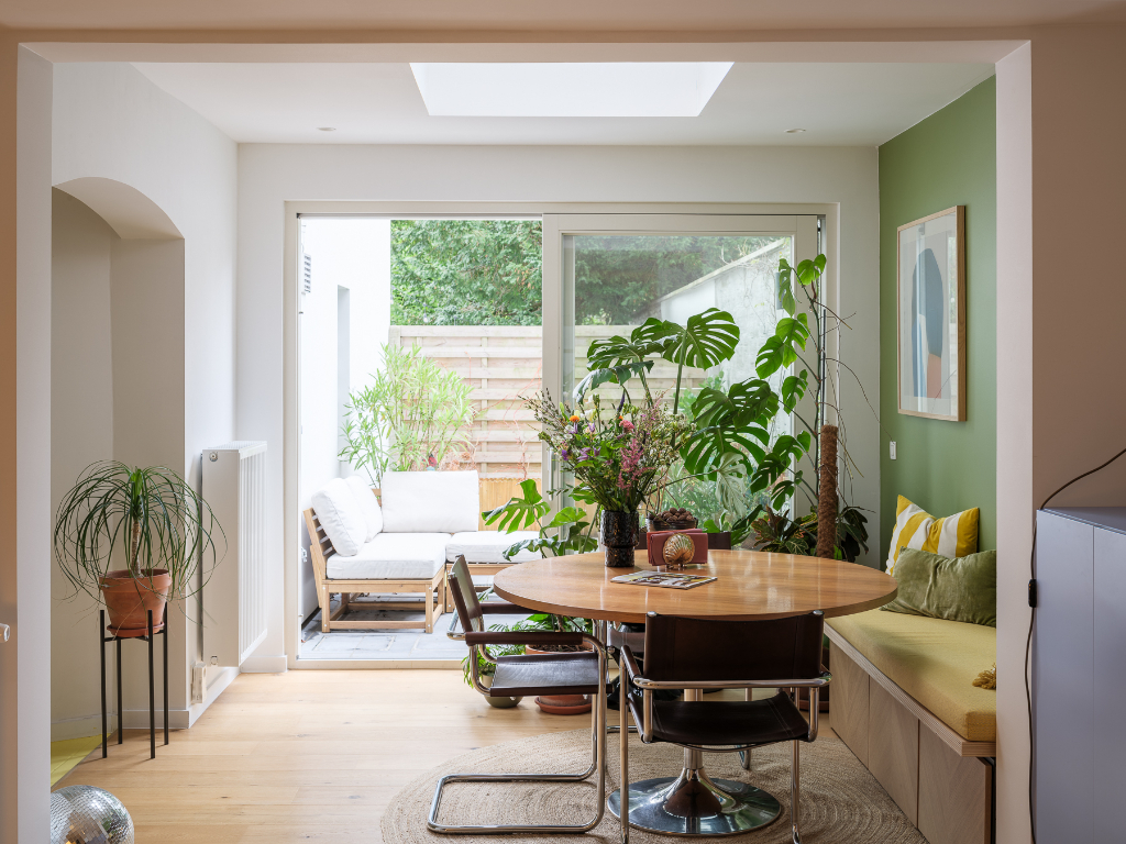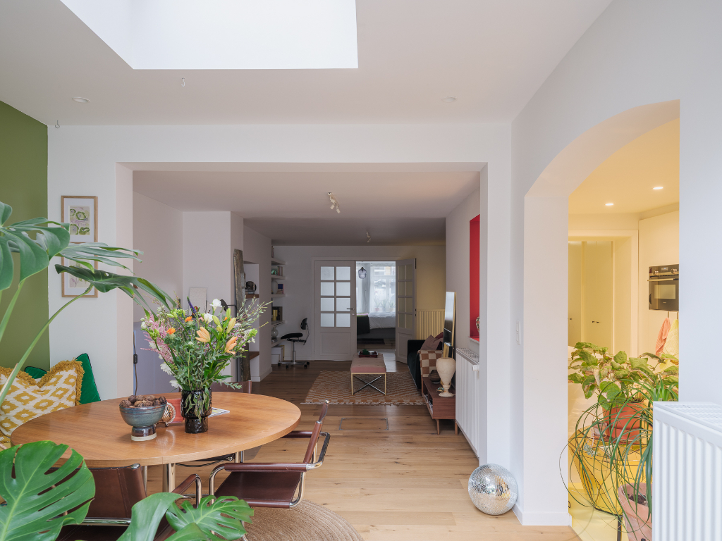 De centrale leefruimte is praktisch in te delen met een gezellige zithoek en een lichtrijke eetplaats, die bovendien toegang biedt tot het terras.