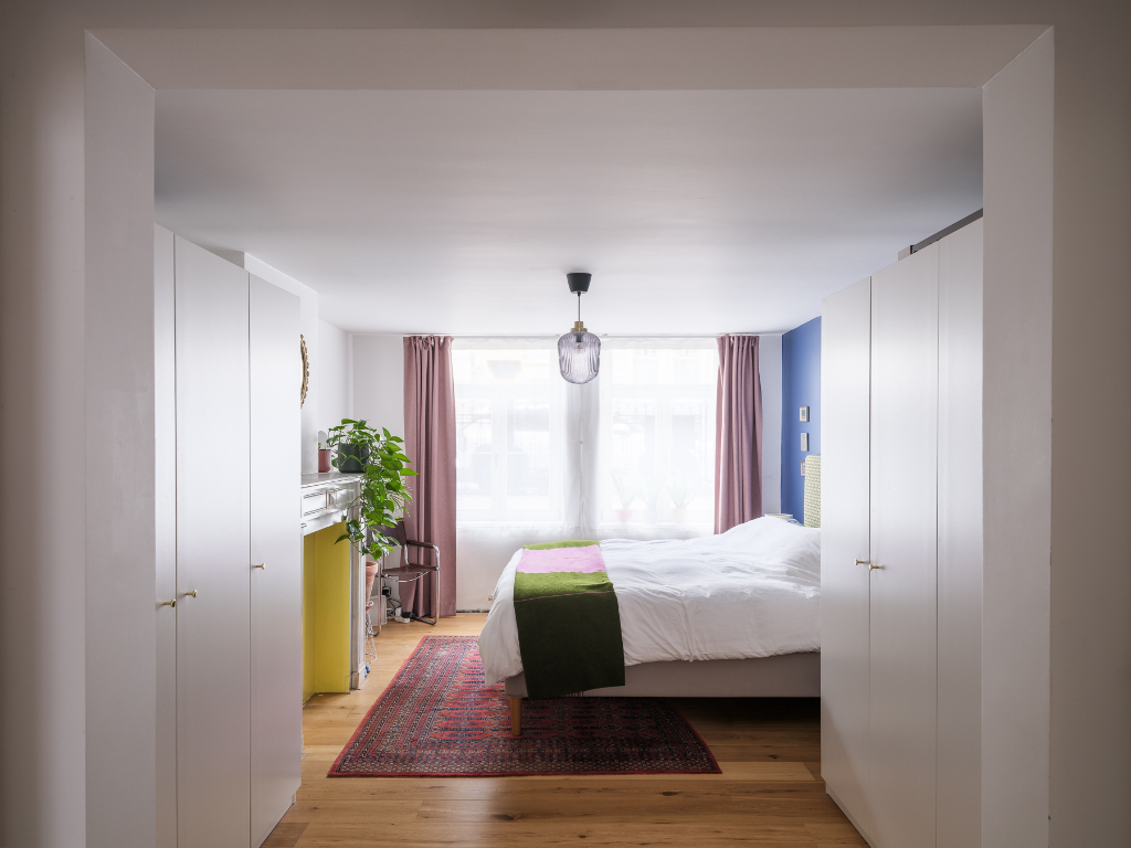 Vooraan vinden we de ruime slaapkamer, voorzien van kasten aan beide zijden.