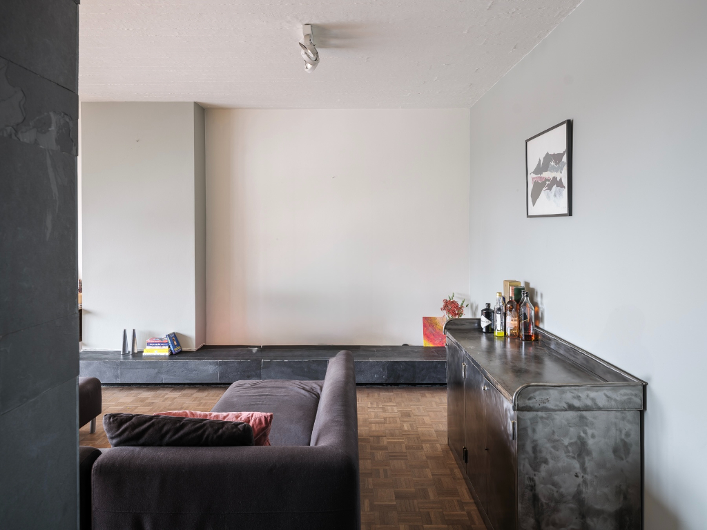 De verhoogde ligging en de open omgeving zorgen voor verre zichten en een privatief wooncomfort. Via de lift betreedt u het appartement, waar de zichtbare betonstructuur en heldere volumes meteen de toon zetten: tijdloos en eerlijk.