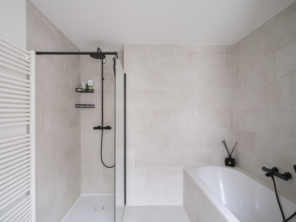 Het 1ste verdiep omvat een ruime slaapkamer, een volledig ingerichte badkamer en een apart toilet op de nachthal.